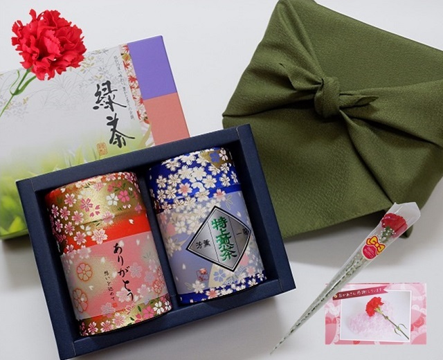 母の日限定 「ありがとう缶」宇治茶ギフト 煎茶・玉露セット 80g 風呂敷包み 送料無料